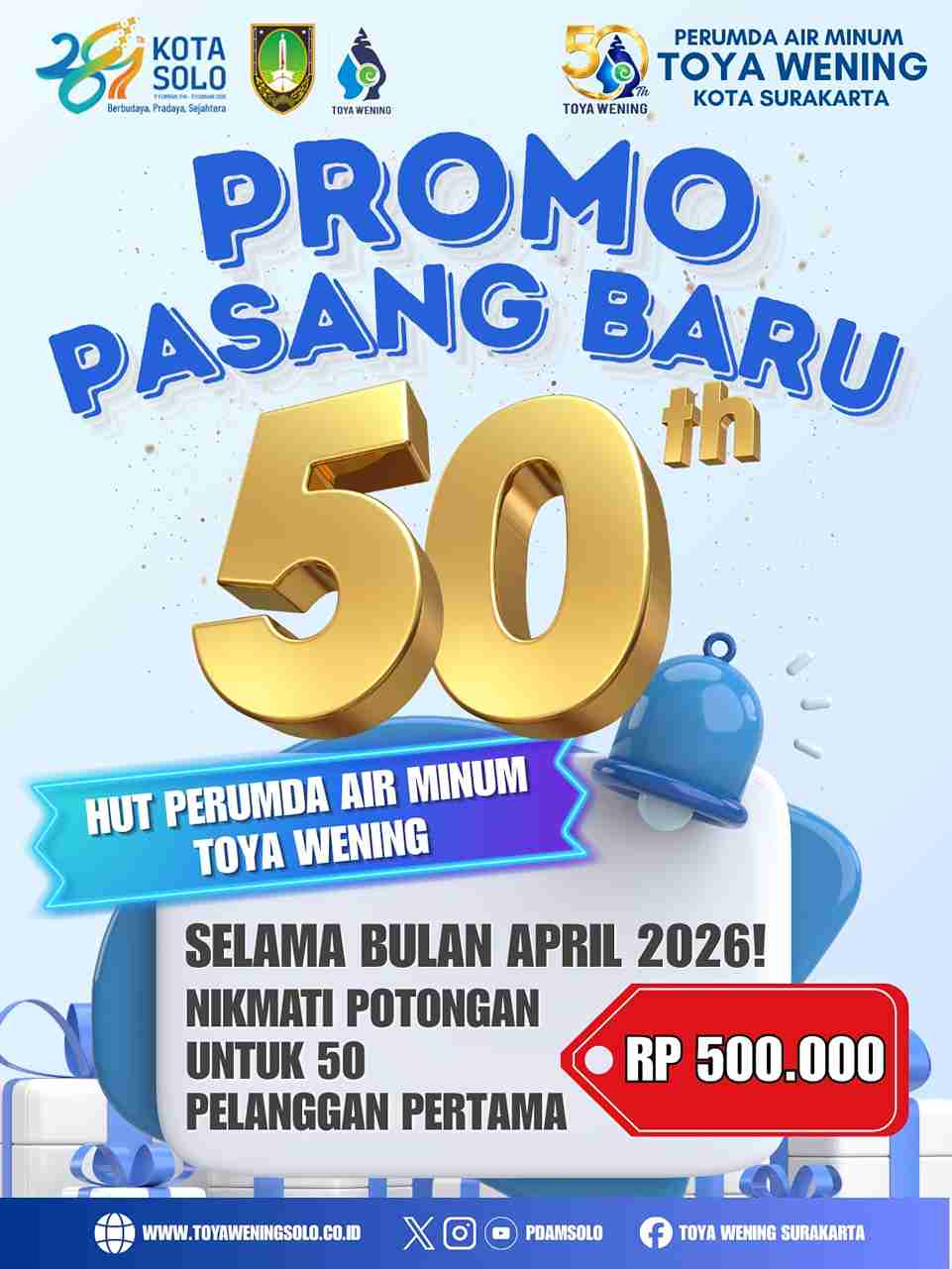KADO SPESIAL HUT KE-50 TOYA WENING! Lagi rencana mau pasang PDAM? ini saat yang paling tepat! Dalam rangka merayakan Hari Ulang Tahun Ke-50, Perumda Air Minum Toya Wening Kota Surakarta bagi-bagi promo spesial buat kamu. Nikmati Potongan Rp 500.000,- untuk Pemasangan Baru!